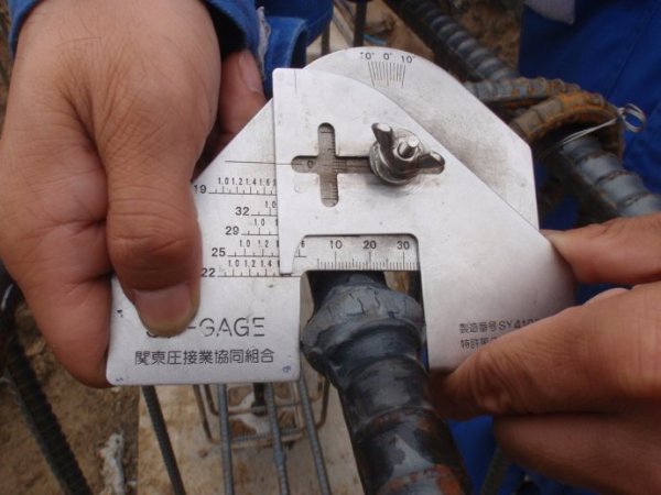 钢筋对接焊接节点测量,局部特写。