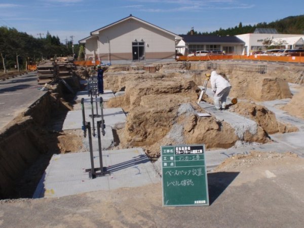 使用大型挖掘机械,进行整个地基土壤的挖掘施工,同步进行基础下部,素混凝土垫层的现场浇注施工。
