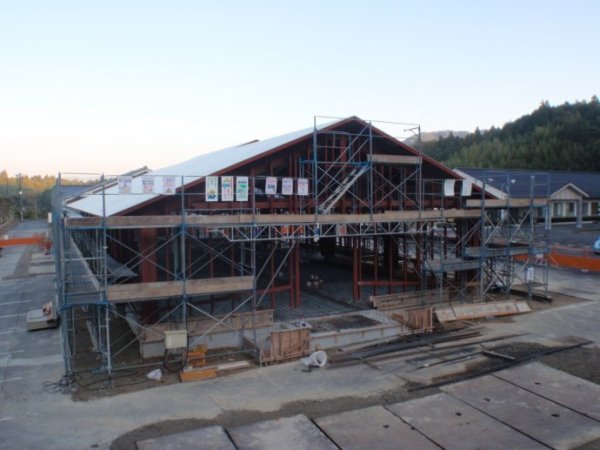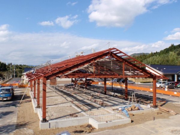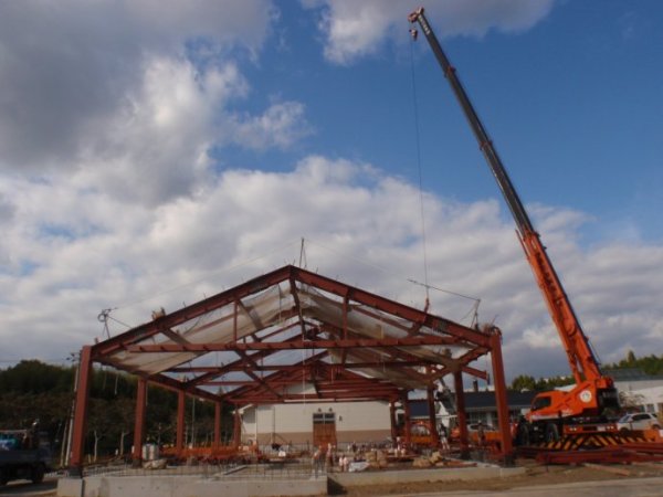 双坡屋面单层钢结构承重框架,搭建施工现场全景。