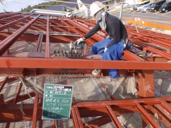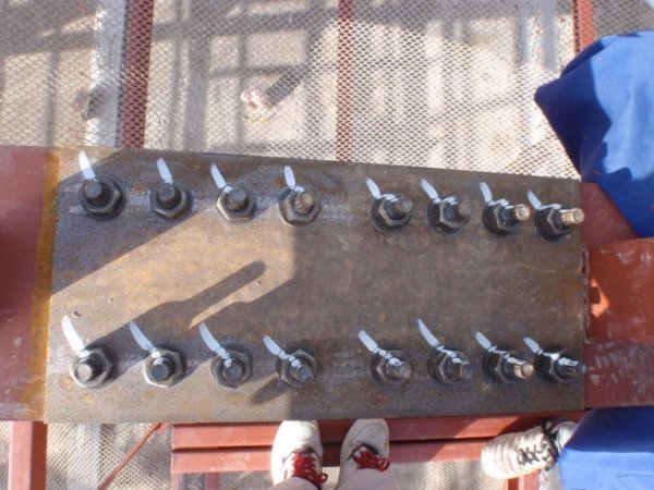可见,钢结构构件,连接节点位置,紧固螺栓上,涂刷了白漆,起到反映松动情况的作用。