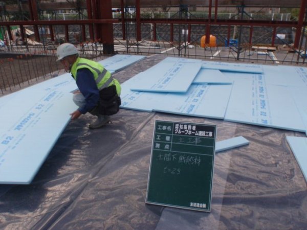室内地面,防水隔潮塑料薄膜的上部,铺设一侧浅蓝色的厚度为2.5厘米的挤塑XPS聚苯乙烯泡沫保温板。