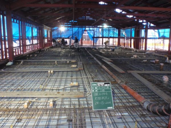 日本住宅保证检查机构的工作人员,在施工现场,进行基础配筋检查验收工作。