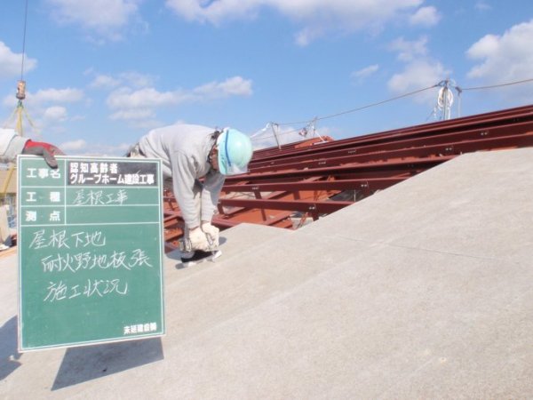 室外屋面上,在钢结构屋架框架的外侧,铺设耐火屋面板,施工现场。