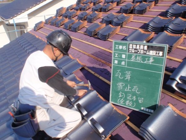 坡屋面上,粘土烧制瓦片,安装固定施工现场。