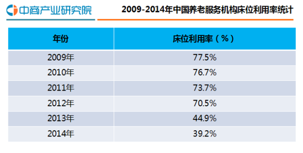 床位利用率可以反映出养老服务机构资源的利用情况。床位利用率高,则表明养老机构资源的利用程度高,反之则低。由2009年的77.5%下降至2014年的39.2%。可见,我国养老服务机构的床位利用率整体水平不高,同时说明我国养老机构的设施利用不足,存在大量的资源闲置。